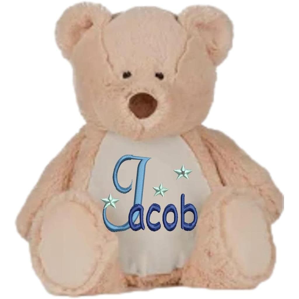 Adorable and super soft beige teddy bear that measures 40m. He is the perfect personalised gift for any little boy or girl. He has zip access and inner removable pad allowing for access to the front of the toy for direct embroidery. Suitable from birth and embroidered with a name and either hearts and stars in a choice of embroidery thread colours.