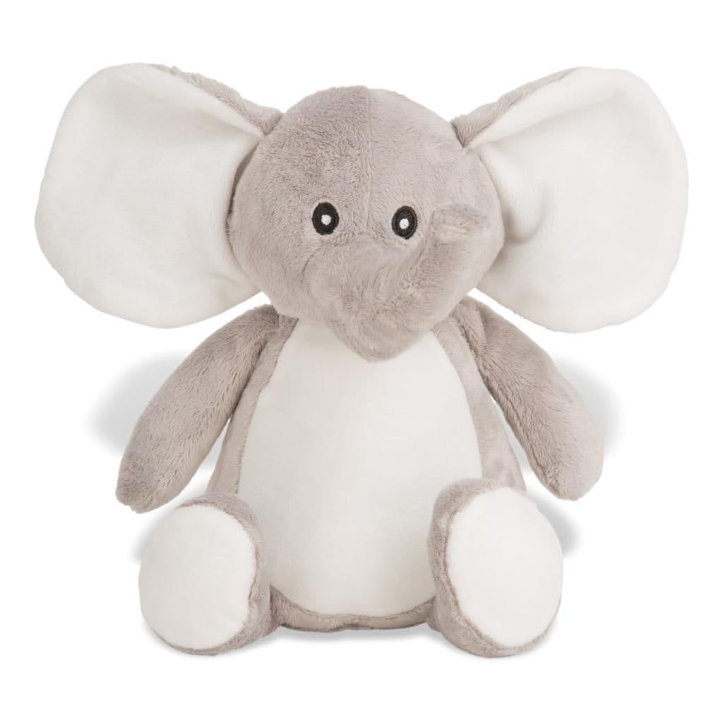 Nellie Elephant measures 42 cm and is made from grey and white plush fur. She is embroidered with your custom message on the tummy. Suitable from birth.