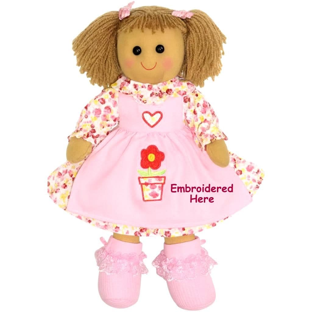 Personalised Rag Doll. Make this rag doll special for any celebration! Eliza comes dressed in a charming removable pink dress featuring a flower pot design. You can personalise her dress with your own embroidered message. She measures 40cm and is suitable for all ages.