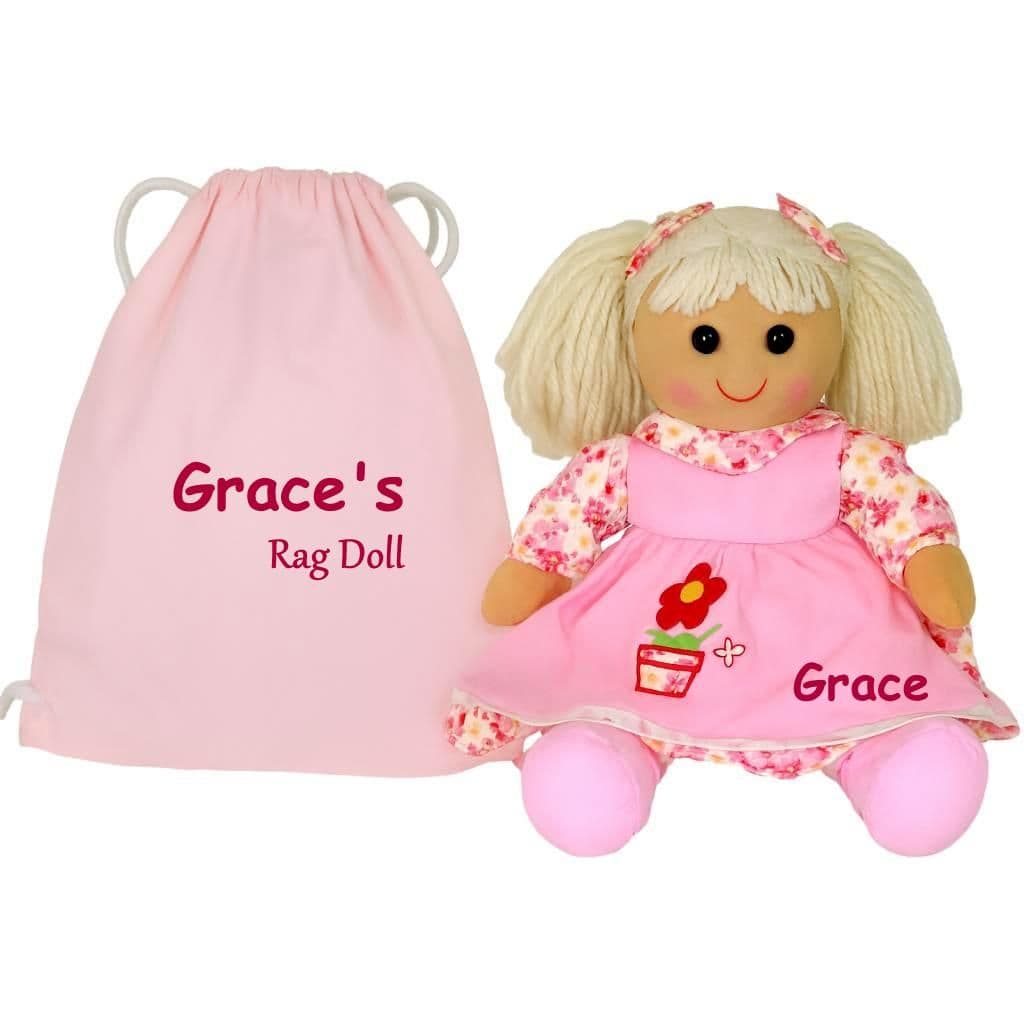 This rag doll measures 40cm and wears a pink floral dress with flowerpot design. Her dress and bag are embroidered with your message.