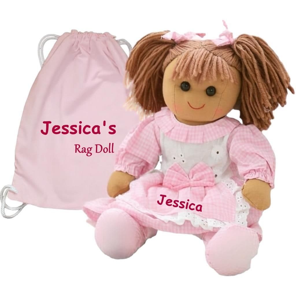 This rag doll measures 40cm and wears a pink floral dress with flowerpot design. Her dress and bag are embroidered with your message.